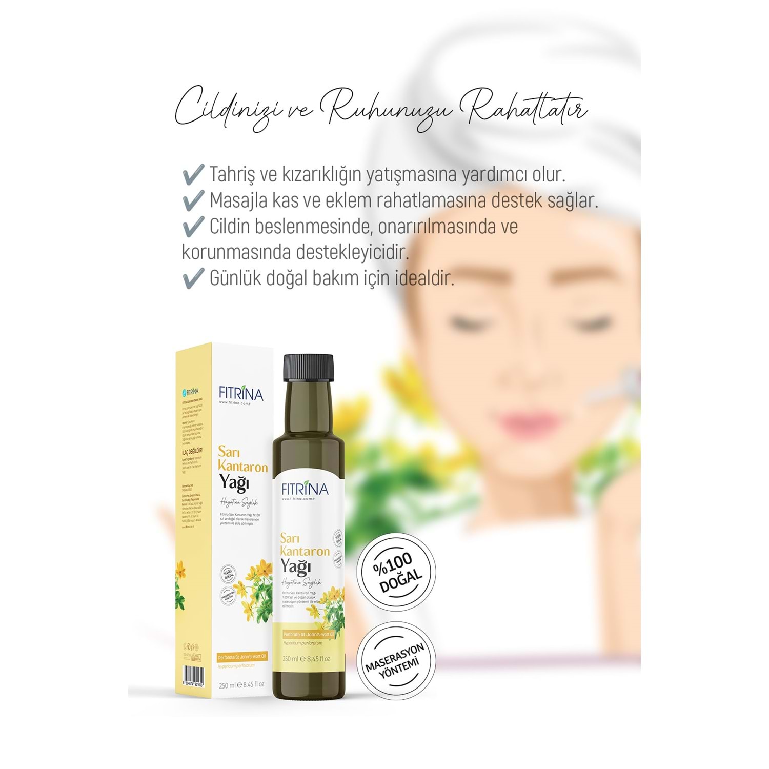 Doğru zamanda toplanan sarı kantaron çiçekleri, soğuk sıkım doğal zeytinyağı ile birleşerek geleneksel bilginin saf hâlini sunar. FITRİNA Sarı Kantaron Yağı 250 ML, hem cilt bakımında hem de geleneksel iç kullanım bilgisinde güvenle tercih edilen doğal bir üründür.