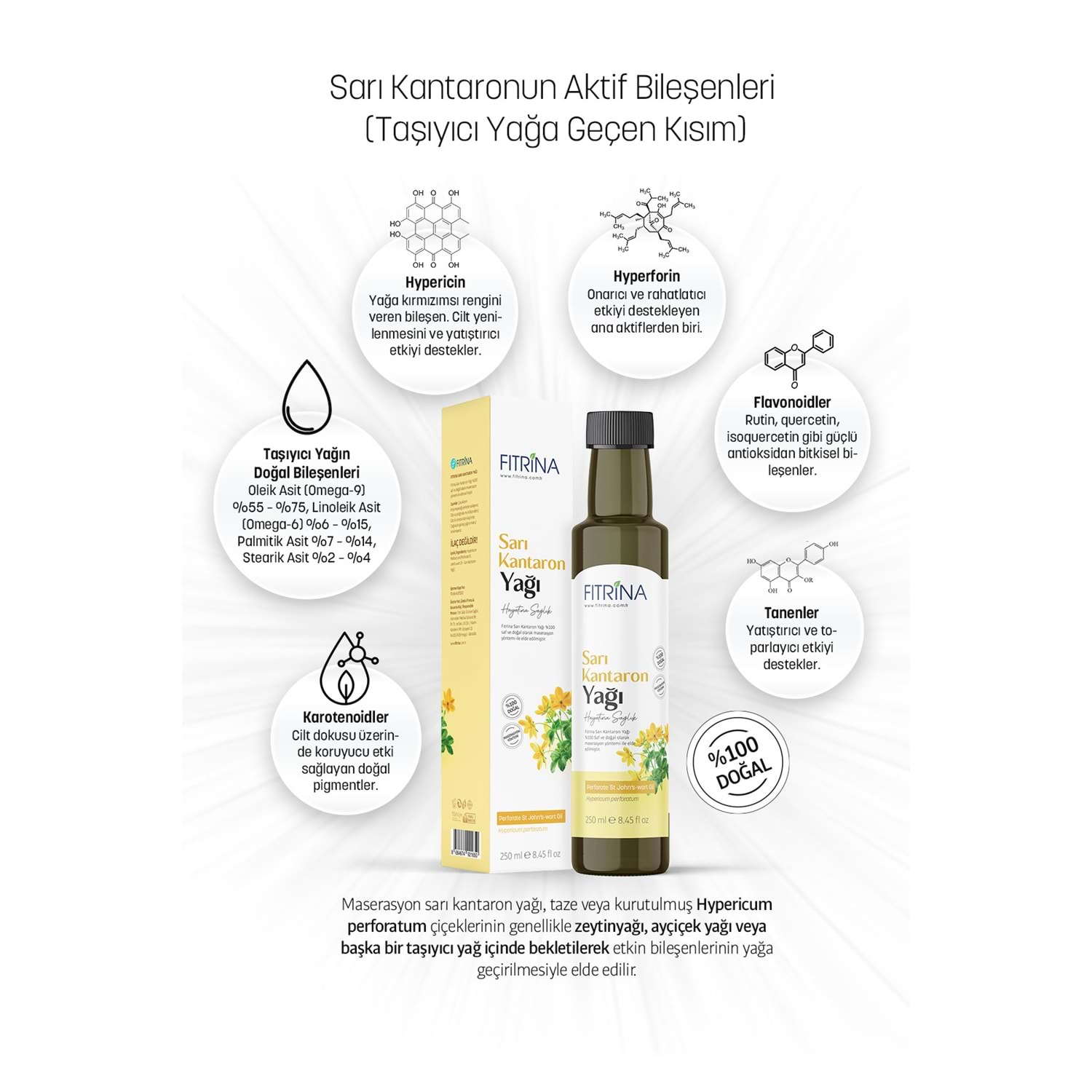 Doğanın en kıymetli bitkilerinden sarı kantaron (Hypericum perforatum), FITRİNA’nın özenli üretim anlayışıyla, soğuk sıkım doğal zeytinyağında geleneksel yöntemlerle masere edilerek hazırlanmıştır. Katkı maddesi, koruyucu, renklendirici veya sentetik içerik barındırmaz. Yoğun kırmızımsı rengi ve kendine has aroması, doğru zamanda toplanmış kantaron çiçeklerinin ve sabırlı üretim sürecinin doğal sonucudur.